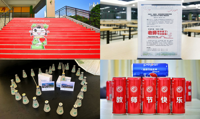 “亲爱的,热爱的,老师您是我们最爱的”、“不要你觉得,我要我觉得,FAFU教师就是最A的”,在教工餐厅,穿着吉祥物“小农”和“小林”公仔的学生为就餐老师送上印有祝福语的定制饮料。餐桌上,《亲爱的,热爱的,老师您是我们最爱的情感DNA片段在FAFU中循环扩增的研究》论文版“教师节感谢信”夺人眼球。校大学生艺术团还走上教工餐厅舞台歌舞表演《光阴的故事》。 教工餐厅外的台阶上,还有“农小林”表情包祝“教师节快乐”,表达对老师的祝福。