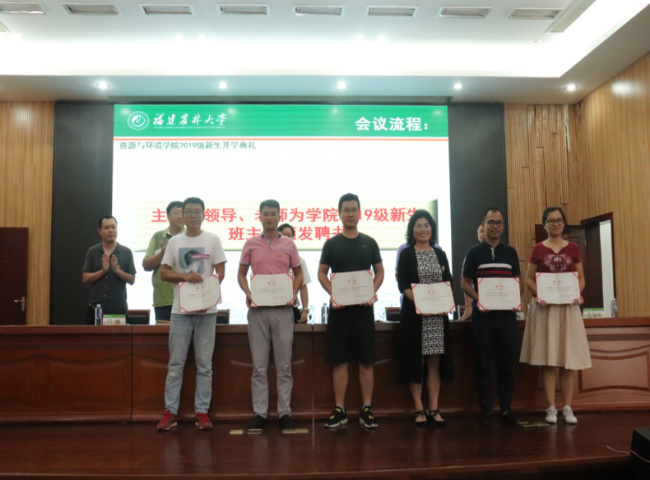 学院领导为学院2019级新生班主任发放聘书。教师代表、新生班主任、金山学者、青年学术新秀廖汉鹏老师;老生代表、院学生会主席2016级环境工程专业肖昕彦同学,以及新生代表、2019级农业资源与环境专业庄煜同学分别做了发言,号召学院全体新同学们学会奋斗和感恩,热爱学校和学院,凝心聚力,担当强农兴农使命,为学校“双一流”高水平大学建设、为农业农村现代化作出新的更大的贡献。