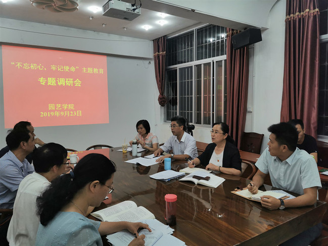 9月23日晚,园艺学院在园艺楼会议室召开“不忘初心、牢记使命”主题教育专题调研会,院党委领导班子成员、全体辅导员、本科生党支部书记、副书记参加会议。会议由院党委书记张华英主持。