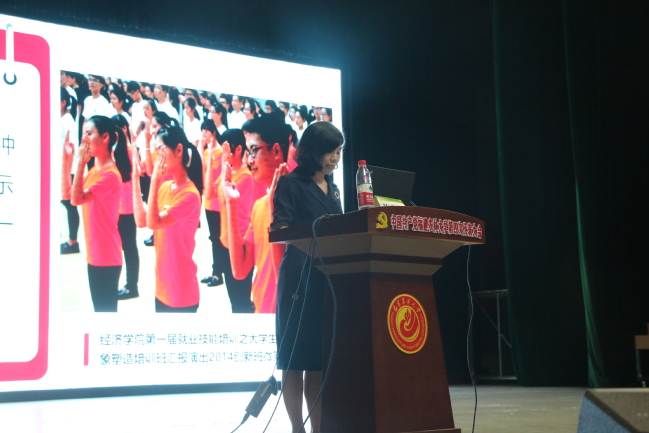 9月25日晚,经济学院在校大礼堂开展了“唱响国歌,礼仪献礼新中国成立70周年”活动。国家高级礼仪培训师、全国专业人才教育专家委员会礼仪委员朱玉华、学院党委副书记陈玲凤,辅导员以及2019级全体新生360余人出席此次活动,活动由朱玉华主讲。