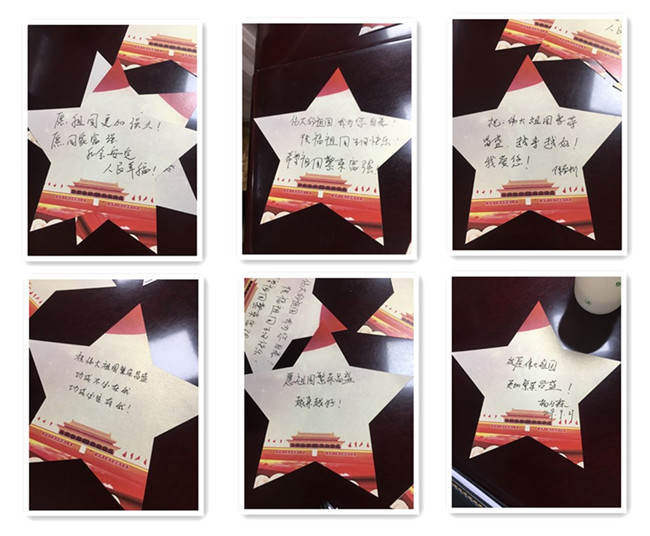在主题党日活动中,全体党员集中收看了《中华人民共和国中央人民政府成立典礼》珍贵影像,并结合各自工作岗位,逐个畅谈了自己的心得体会。支部还创新主题党日活动形式,开展了“我对祖国有话说”活动,全体党员在五角星形的卡片上写下了自己对祖国的真挚祝福。