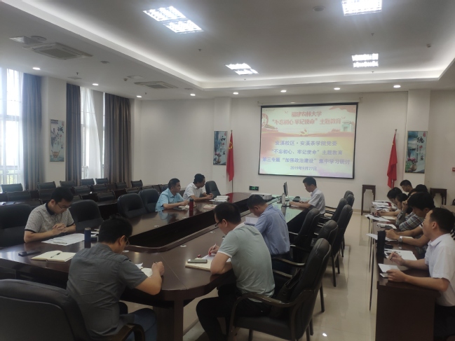 9月27日,安溪校区·安溪茶学院党委召开党委理论中心组扩大会议,开展“不忘初心、牢记使命”主题教育第三专题集中学习研讨,围绕“加强政治建设”这一主题进行学习研讨交流。院党委书记雷国铨主持会议,党委副书记黄成茂作重点发言,中心组成员、科级干部、党支部书记参会。