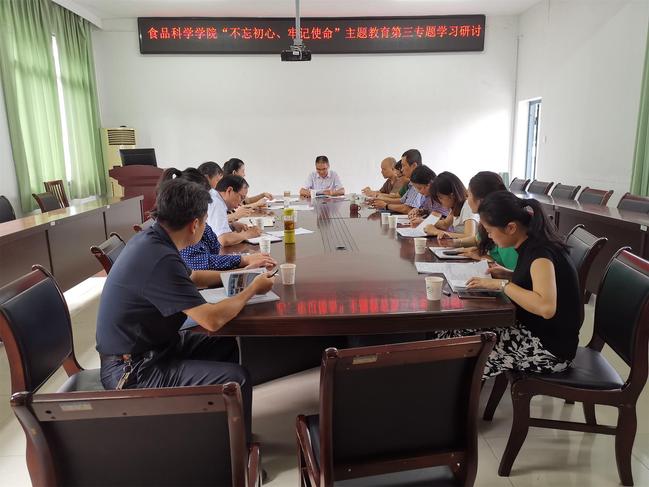 9月27日上午,食品科学学院党委在加工楼406会议室开展“不忘初心、牢记使命”主题教育第三专题“加强政治建设”集中学习研讨。学院党委理论中心组成员、科级干部、党支部书记参会。学院党委书记苏健涵、副院长张怡作重点发言。