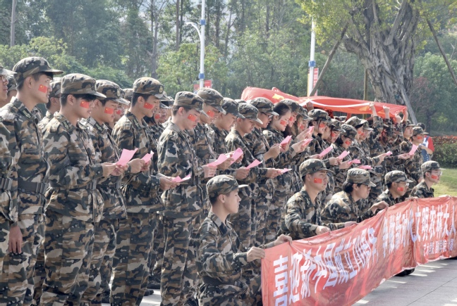 活动在雄壮的国歌声中拉开帷幕,新生们身穿军训服装,佩戴校徽昂首挺立,依次排出“中国”、“70”队列形状,在场师生高唱国歌,将活动气氛带入高潮。全体师生挥舞手中的国旗,高喊“祖国我爱你”,向祖国70周年华诞献礼,表达了学院师生对伟大祖国的美好祝愿。