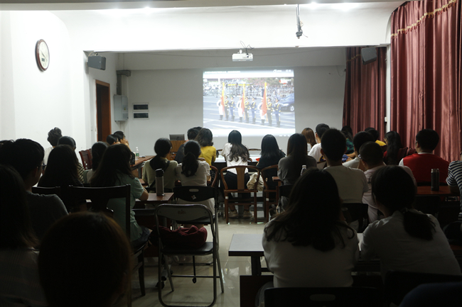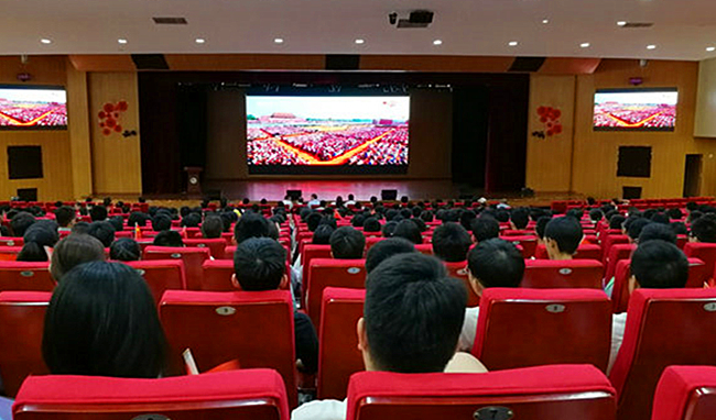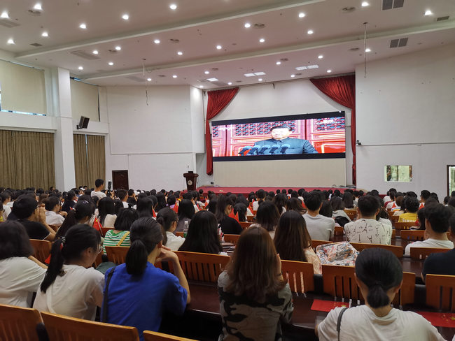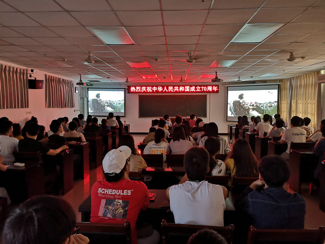 在校礼堂,学校组织集中收看庆祝大会盛况,大礼堂座无虚席。上午10时,庆祝大会正式开始,声声礼炮轰鸣,庄严的国歌声中,五星红旗冉冉升起,现场师生集体起立,唱国歌,向国旗致敬。师生认真聆听学习习近平总书记在庆祝大会上的重要讲话。当阅兵仪式开始,高亢嘹亮的检阅号角响起,检阅车驶出天安门,习近平主席向着受阅部队驶去时,大礼堂里响起了热烈的掌声,师生心怀喜悦,为伟大的祖国感到自豪和衷心祝福,切身感受到70年来我国取得的历史性成就、发生的历史性变革。三军列阵,铁甲生辉;雄狮战鹰,雷霆之势,击万里长空。一个个振奋人心的场面,一声声气势恢宏的解说,一首首激昂有力的配乐,将大礼堂的氛围引入一个又一个高潮,现场掌声、欢呼声不断,同学们挥舞国旗,气氛极为热烈。