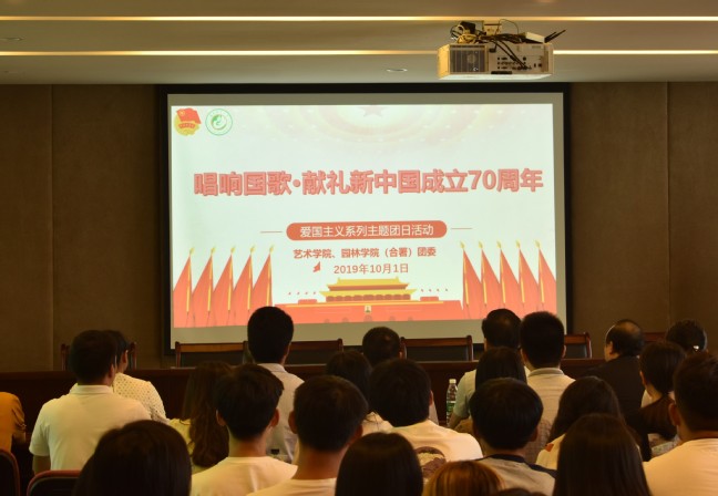 10月1日上午,为庆祝祖国七十华诞,艺术园林学院于明南附307室举行“唱响国歌·献礼新中国成立70周年”主题团日活动。学院党委书记陈为德,院长张飞萍,党委副书记曹伟,副院长黄启堂、陈祖建、陈小英、彭东辉,党委秘书李燕红,院党委委员林皎皎,办公室主任钟玉坤,各年级辅导员及学生代表共200人参加。活动由院团总支书记孙玉婷主持。