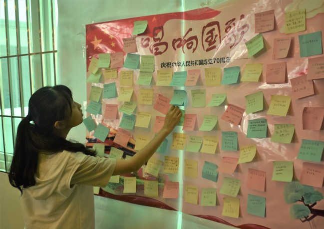 活动最后,同学们在心愿贴上写下了“祝福祖国,我把青春献给您”、“愿祖国繁荣昌盛”等对祖国的美好祝愿,并纷纷拿起手中的国旗,与团旗合影、为青春点赞、为祖国祝福!