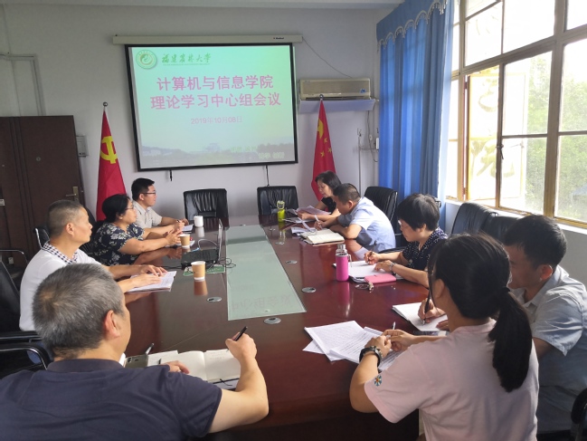 10月8日下午,计算机与信息学院党委理论学习中心组在学院会议室学习贯彻习近平总书记在中华人民共和国成立70周年大会和国家勋章和国家荣誉称号颁授仪式上的重要讲话精神。会议由院党委书记孙淑芹主持。