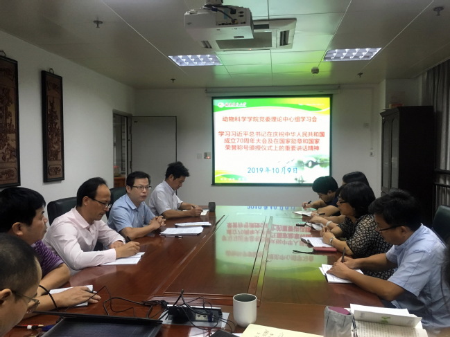 10月9日,动物科学学院党委召开理论中心组学习会,专题学习贯彻习近平总书记在庆祝中华人民共和国成立70周年大会及在国家勋章和国家荣誉称号颁授仪式上的重要讲话精神,学院党委委员、各党支部书记、全体辅导员和部分科级干部参加了学习会。会议由院党委副书记(主持工作)黄毅军主持。