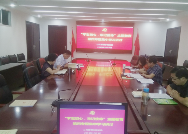 10月9日,公共管理学院党委开展“不忘初心、牢记使命”主题教育第四专题集中学习研讨。本次学习研讨主要围绕“牢记为民宗旨”这一主题进行。学院党委书记曾起郁主持学习会,学院党委领导班子成员参加了学习会。
