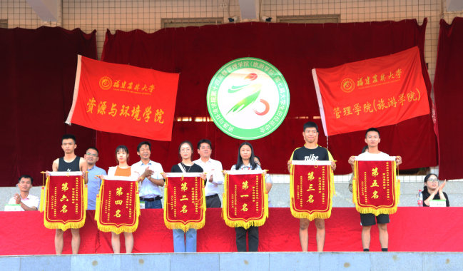紧张激烈的角逐之后,本届运动会渐入尾声。闭幕式上,院长苏时鹏、副院长陈贵松到会为获奖选手与团体颁奖。闭幕致辞中,苏时鹏对全体参与筹备、赛事工作的师生表示了感谢,对获奖群体致以祝贺。伴随阵阵欢呼,管理学院(旅游学院)第七届大学生田径运动会圆满落幕。