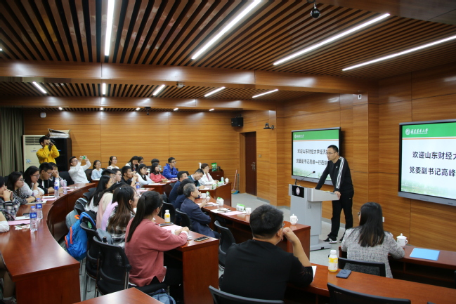 10月26日上午,山东财经大学经济学院党委副书记高峰、农业农村系主任齐永华、农村区域发展系主任孙小燕等师生一行20人来访经济学院,深入调研经济学院全国首届乡村振兴班的创建和运行经验并座谈。院党委副书记陈玲凤,农村区域发展系主任刘飞翔,农区系教师代表潘国亮、张俊娜以及2018、2019级乡村振兴班学生代表参加了交流座谈会。