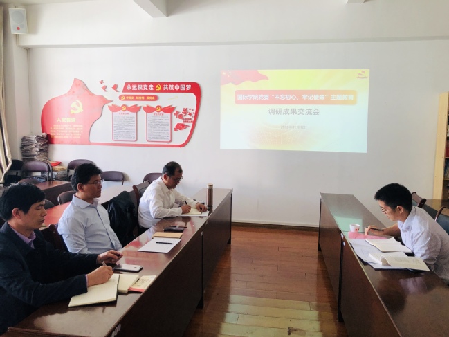 11月1日下午,国际学院党委在明北附305会议室召开“不忘初心、牢记使命”主题教育调研成果交流会,院领导班子成员参会, 院党委书记肖红新主持会议。