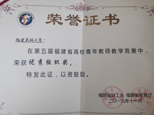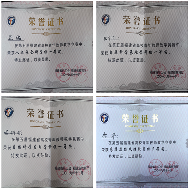 11月1日-3日,第五届福建省高校青年教师教学竞赛决赛在集美大学举办。来自全省39所高校的122名青年教师汇聚一堂,切磋技艺。根据10个课时教学设计(网络提交)、20分钟课堂教学、45分钟教学反思等几个环节综合评定,我校4名参赛教师勇夺3个一等奖,1个三等奖,创出历届竞赛最好成绩。我校管理学院坚瑞、食品科学学院张宁宁、植物保护学院黄彬彬老师分别荣获人文社会学科组、自然科学基础学科组、自然科学应用学科组一等奖,均被授予“福建省高校青年教学能手”荣誉称号;马克思主义学院李芊老师荣获思想政治教育组三等奖,被授予“福建省高校青年教学新秀”荣誉称号;学校获评“优秀组织奖”荣誉称号。