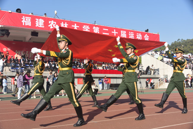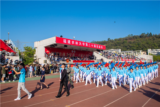 运动会组委会主任、副校长黄炎和在开幕式上致辞,他代表校党委、校行政,向精心筹备本届运动会的全体工作人员表示衷心的感谢,向参加本届运动会的全体运动员、教练员、裁判员以及参加演出的同学们表示亲切的慰问和美好的祝愿。黄炎和指出,学校一年以来紧紧围绕立德树人根本任务,持续深化体育教育教学改革,在竞技体育方面也是硕果累累,共获得国家级和省级奖项58项,在2019年全国大学生第十九届田径锦标赛中荣获阳光组女子团体总分第一名、男女团体总分第七名的佳绩,团体总分在福建省参赛高校中位列第一,两项成绩打破学校田径最高纪录。他希望所有运动员能够以高昂的斗志、顽强的作风、精湛的技能,在竞技场中挑战自我、超越自我;希望所有裁判员认真履行职责,严格比赛规则,公平公正裁决;希望广大观众为运动员摇旗呐喊,加油鼓劲,认真细致做好后勤保障服务工作。他说,希望大家将体育运动中所蕴涵的不断进取、永不满足的奋斗精神,不畏艰难、敢攀高峰的拼搏精神融入到学校新一轮的改革发展中,转化为广大师生奋发有为的前进动力,为学校建设农林特色鲜明的全国一流大学做出新的、更大的贡献。