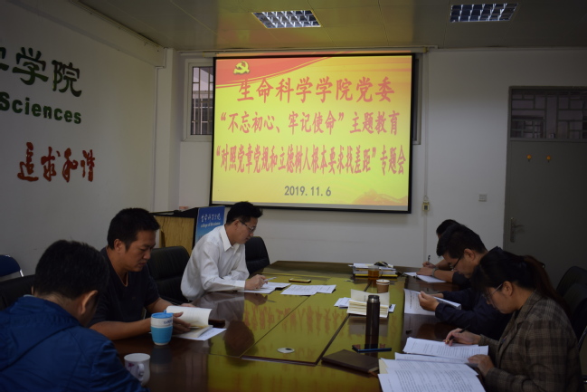 11月6日上午,生命科学学院党委在生科楼404室召开“不忘初心、牢记使命”主题教育对照党章党规和立德树人根本要求找差距专题会议。会议由党委书记林豪森主持,理论中心组成员参会。