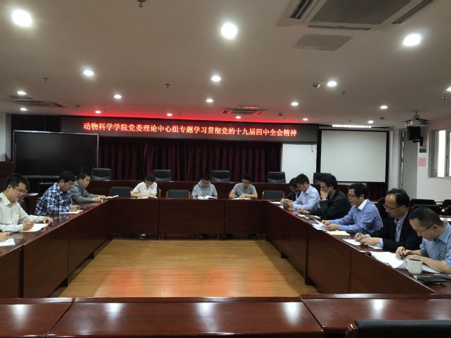 11月7日,动物科学学院党委在学院会议室召开理论中心组(扩大)会议,专题学习贯彻党的十九届四中全会精神。学院领导班子,部分党委委员、党支部书记、科级干部和辅导员等参加了学习会。会议由院党委副书记(主持工作)黄毅军主持。