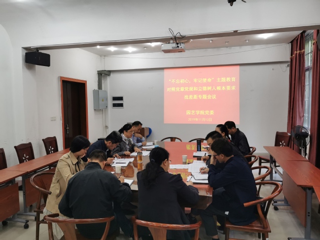 11月13日,园艺学院党委在学院会议室召开对照党章党规和立德树人根本要求找差距专题会议。校第二巡回指导组成员张明辉、陈伟到会指导。会议由院党委书记张华英主持,学院党委委员、领导班子成员出席会议。