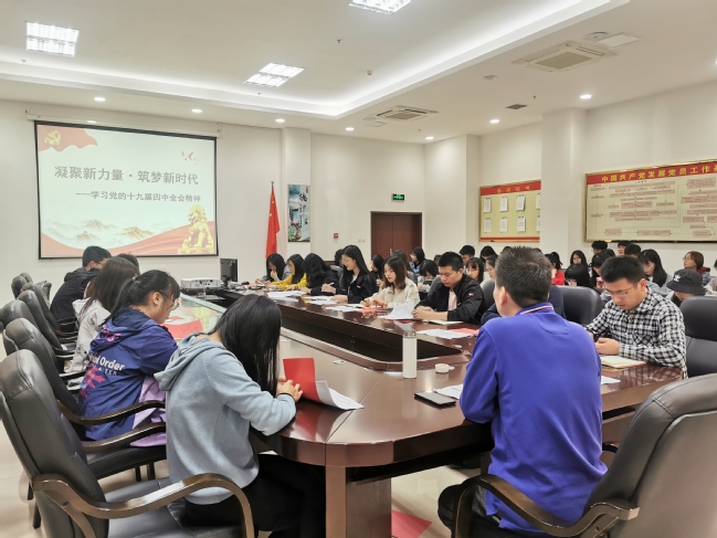 会上,王刚结合工作实际就学习贯彻党的十九届四中全会精神作了分享,学生代表施玉韩带领大家做“凝聚新力量·筑梦新时代”专题学习,重点介绍了党的十九届四中全会做出的关于坚持和完善中国特色社会主义制度、推进国家治理体系和治理能力现代化重要决定,明确了两个“青目标”,即要深入学习领会中国特色社会主义制度发展和我国国家治理的历史性成就,增强“四个意识”,坚定“四个自信”,坚决做到“两个维护”,砥砺爱国情怀,激发奋斗精神,团结引领广大同学充分发挥专业优势,不忘初心,牢记使命,锐意进取,开拓创新,凝聚新青年力量,筑梦新时代征程,为实现“两个一百年”奋斗目标、实现中华民族伟大复兴的中国梦而努力奋斗。两名学生代表结合学生工作做学习心得分享。