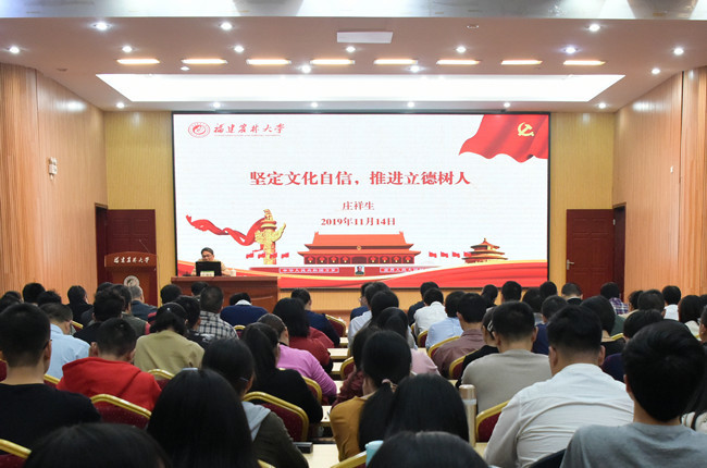 11月15日下午,校党委副书记庄祥生为学校师生代表作题为“坚定文化自信,推进立德树人”主题教育专题党课。庄祥生从我们文化自信的历史文化根基、近代中国的危机根本上是文化的危机、中国共产党的文化自信必须立足中国优秀传统文化三个方面讲专题党课。