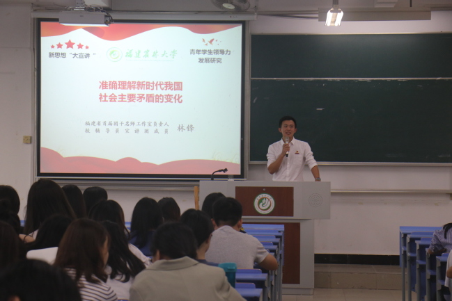 杜泽宇以“什么是新中国?”开始进行理论宣讲,播放了祖国70周年国庆阅兵仪式视频,让学生们再次感受祖国的繁荣发展与强大。他分析了社会主义核心价值观“24个字”以及“两个一百年”奋斗目标,提出“中国共产党是什么?”的问题,并以“菌草之父”林占熺教授等共产党员为例子,阐述中国共产党全心全意为人民服务的根本宗旨。