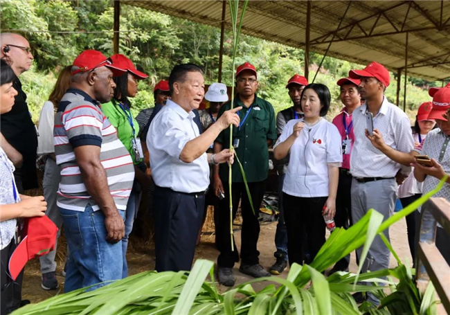 2019年6月20日,开云网页版国家菌草工程技术研究中心首席科学家林占熺(前中)在福建三明市泰宁县大田乡垒际村向外国客人介绍菌草的种植情况。新华社记者林善传摄