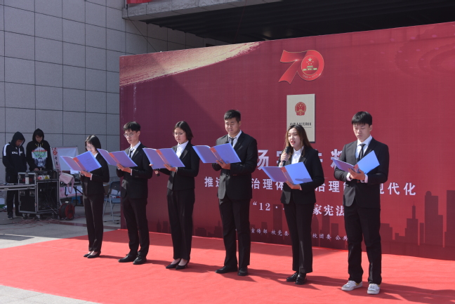 12月4日是我国第六个国家宪法日,为深入学习贯彻十九届四中全会精神,弘扬宪法精神,进一步提高师生的法律意识,推进“法治校园”建设。我校在拓荒广场组织开展了12•4国家宪法日主题教育系列活动。校党委副书记曾华平与宣传部、学工部、校团委、公共管理学院等单位有关负责人及现场300多名同学一同参加了国家宪法日系列活动。