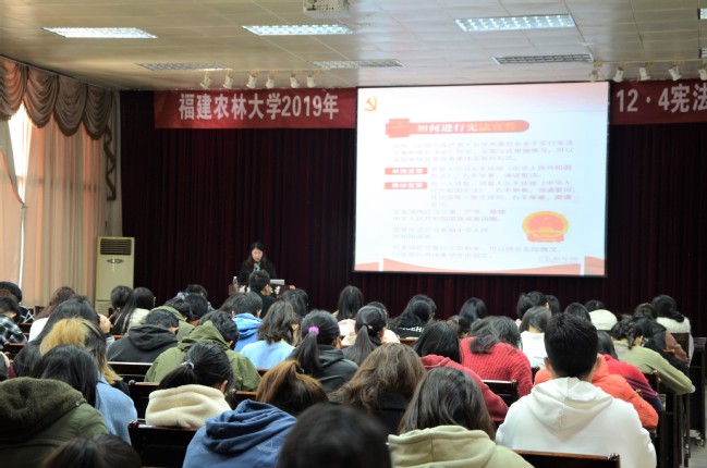 活动现场设有法治宣传展板区、法学优秀校友展示区、法律咨询区、“丹青绘宪法”海报比赛区、百米长卷绘画区、法庭道具区及普法游戏区。其中,法治宣传展板区涵盖了我国法治进程、十九届四中全会精神、国家安全法、新时代爱国主义教育和当下热点时事案例等。优秀校友区展现了农大法学系学子立足岗位、敬业奉献的风采,以此号召同学们见贤思齐、争先创优。法律咨询区邀请到9家律师事务所的专业律师和法学专业老师为在校师生在生活中遇到的各种法律问题及学生就业中可能遇到的法律问题提供咨询和指导,其中福州海关受邀参加此次宪法日主题教育活动。现场还有《法在心中》宪法朗诵剧、《我和我的祖国》快闪活动、《律政俏佳人》舞台剧及宪法宣誓活动,同时结合宪法知识开展了一系列趣味普法游戏,旨在以灵活多样的普法形式寓教于乐,引导全校师生自觉学习宪法和尊崇宪法,营造全校弘扬宪法精神、维护宪法权威的良好法治氛围。在多功能厅内,法学系杨晓丹老师专题讲座也在同时进行,通过杨晓丹深入细致准确的分析,拉近了同学们宪法之间的距离,加深了同学们对党和国家事业发展新成就、新经验、新要求的了解。