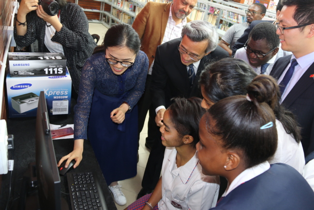 启动仪式后,林松添和苏克拉尔共同参观了“中国角”。学生们在已正式交接并投入使用的电脑上试用汉语学习软件,林松添为学生们示范了汉语学习软件发音练习和汉语书写功能的使用,现场气氛活跃。