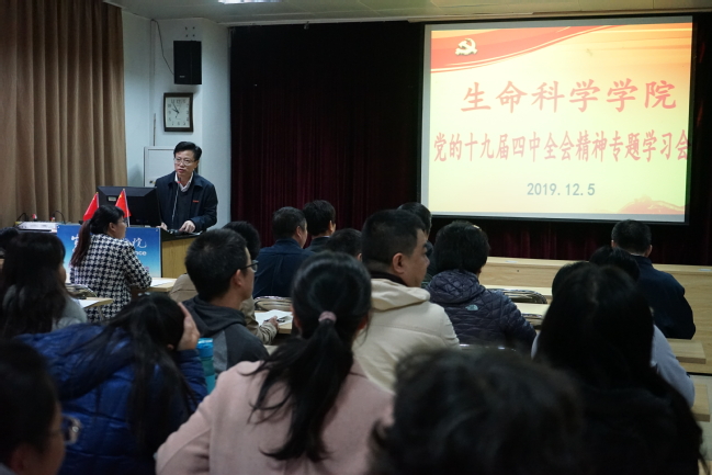 12月5日下午,生命科学学院在生科楼414会议室召开全院教职工大会,专题学习党的十九届四中全会精神。会议由学院党委书记林豪森主持。
