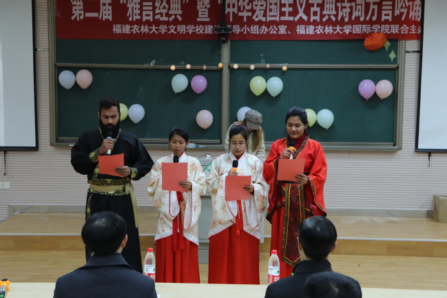 12月6日晚,由校文明办、国际学院联合主办,国学部承办的第二届“雅言经典”暨“中华爱国主义古典诗词方言吟诵”大赛决赛在禧强楼207举行。国学部张宁、李仁生、林文华、傅晓翎、陈然等五位专任教师担纲评委。