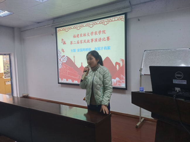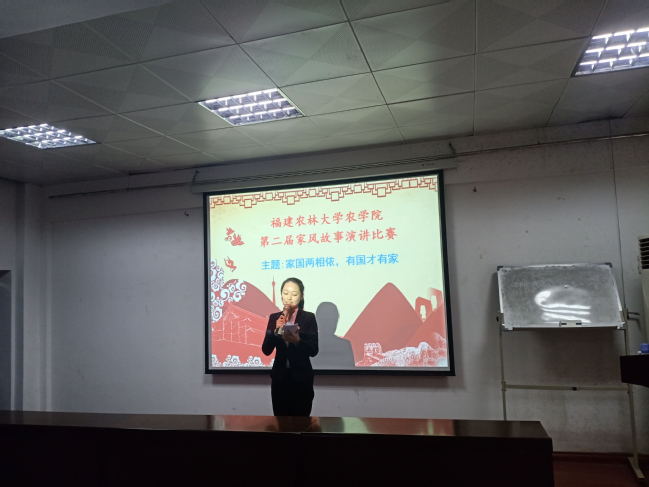 据悉,本次比赛的选手是从农学院第二期家风故事50篇征文中层层筛选出十位优秀作者参加演讲比赛。经过前期充足的准备,选手们先后上台向评委老师和观众演绎他们对祖国深深眷恋、家国两相依的情怀。其中,吴言同学谈到:“先有国家强,而后家庭安宁。古人云‘国富则民强,民强则国盛,国盛则民安,民安则天下太平。’自古家国两相依,国家兴亡,匹夫有责,今日亦然。无家何来国,无国何有家,是国家的富强保护了一个个家庭的完整,亦是国家的富强给予了无数家庭幸福。”。她饱含感情的演讲激发听众共鸣,最终获得了本次比赛的一等奖。