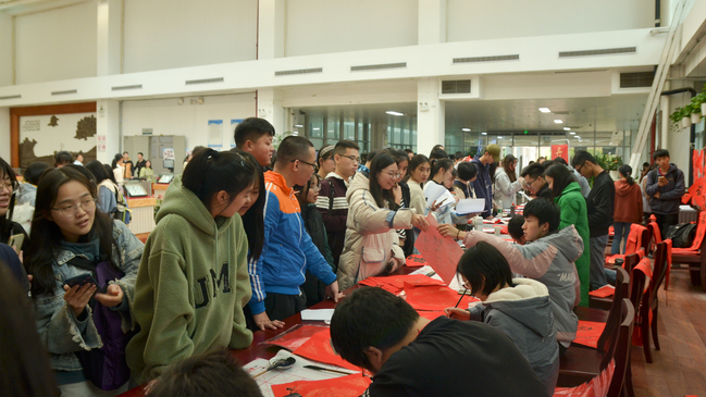 活动现场墨香四溢,气氛热烈,到处洋溢着喜气亮丽的“中国红”。来访师生一边欣赏春联书法作品创作之酣畅淋漓,一边感受楹联工整格律的对仗之美。红红火火的春联,表达了辞旧迎新的美好心情和奋进新时代、再创新辉煌的美好愿景,营造了浓浓的春节氛围。