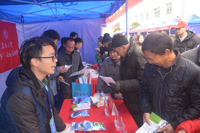 活动现场,我校根据当地实际情况,发挥专业和学科优势,为村民精心准备了优质改良马铃薯种子、优质肥料以及马铃薯产业、茶产业的推广宣传手册、作物提质增效施肥技术等科普资料,还提供农业科技现场咨询服务,并向泰宁15所小学赠送了《生态文明教育》系类丛书。活动现场热烈,前来咨询的农民络绎不绝,来自资源与环境学院的吴良泉副教授和园艺学院的林宏政老师逐一解答了村民们提出的各种技术疑难问题,为当地农业生产发展、农民增收致富提供技术指导。