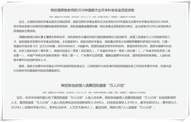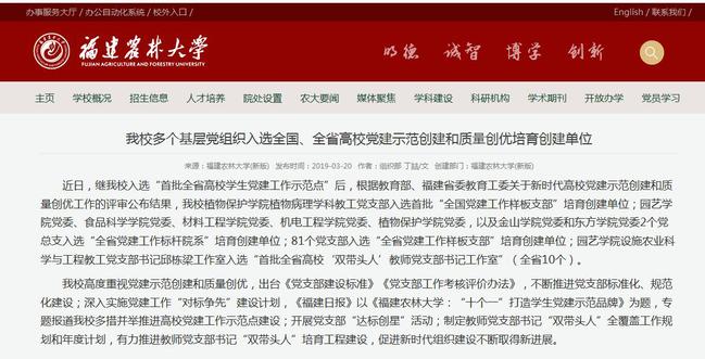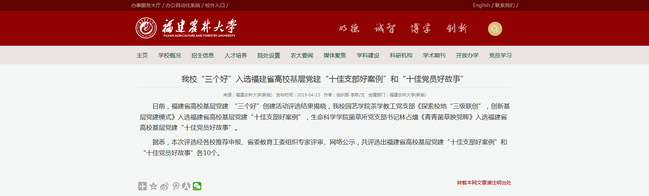 11、2019年4月,福建省高校基层党建 “三个好”创建活动评选结果揭晓,我校园艺学院茶学教工党支部《探索校地“三级联创”,创新基层党建模式》入选福建省高校基层党建“十佳支部好案例”,生命科学学院菌草所党支部书记林占熺《青青菌草映党晖》入选福建省高校基层党建“十佳党员好故事”。