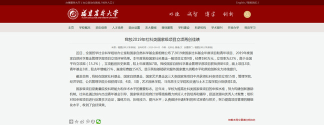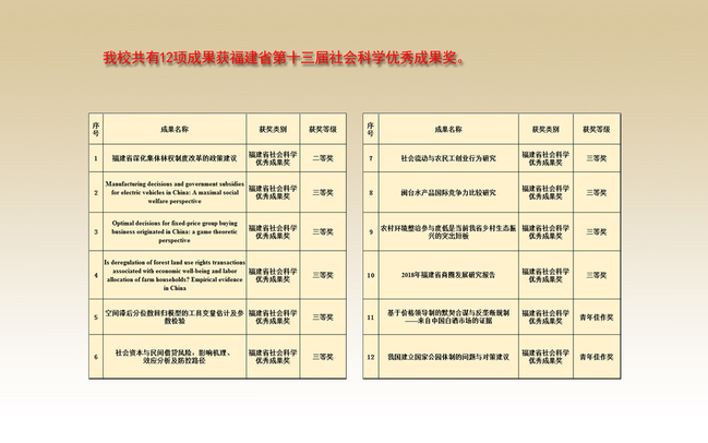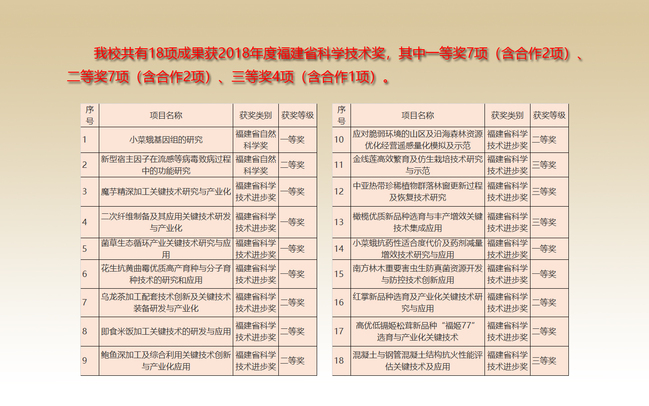 33、2019年10月,福建省人民政府门户网站公布了“福建省人民政府关于2018年度省科学技术奖励的决定”,我校共有18项成果获2018年度福建省科学技术奖,其中一等奖7项(含合作2项)、二等奖7项(含合作2项)、三等奖4项(含合作1项)。2019年12月,福建省人民政府门户网站公布了“福建省人民政府关于颁发福建省第十三届社会科学优秀成果奖的决定”,我校共有12项成果获奖。