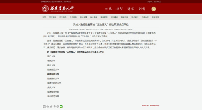 25、2019年7月,省教育工委下发《中共福建省委教育工委关于公布福建省高校“三全育人”综合改革试点单位名单的通知》(闽委教思[2019]22号),我校等全省10所高校入选“三全育人”综合改革试点高校。