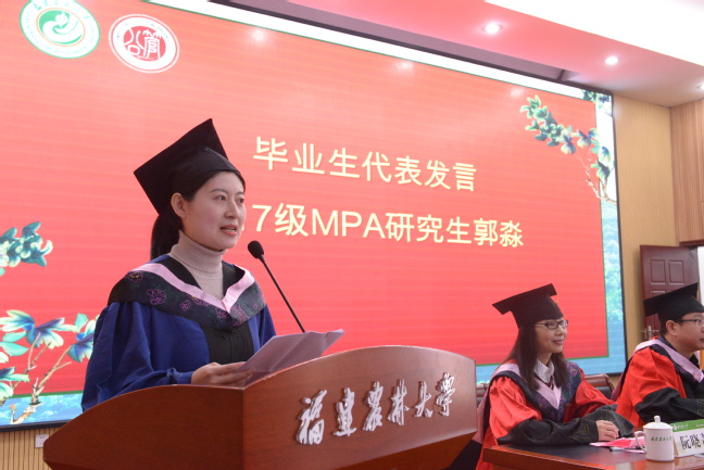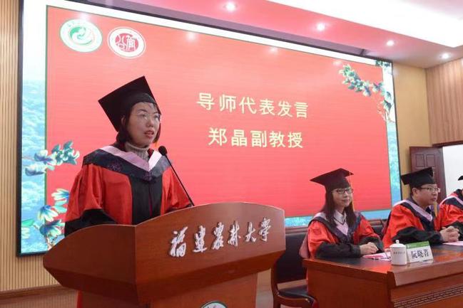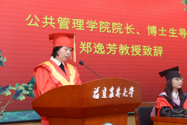 毕业典礼在庄严肃穆的国歌声中拉开序幕。院长郑逸芳首先作热情洋溢的致辞。她代表学院全体教职员工向90位毕业生表示最热烈的祝贺,向毕业生导师、家属致以由衷的敬意和感谢!她介绍了学院在学科建设、研究生教育等方面取得的成果,希望毕业生们坚定理想信念、勿忘初心、志存高远、立足当下,继续践行“明德、诚智、博学、创新”的校训,牢记“立德固本、成人成己”的院训,保持刻苦学习的精神,奋力拼搏、努力攀登、追求卓越,为实现中华民族伟大复兴的中国梦贡献农林大人的一份力量。