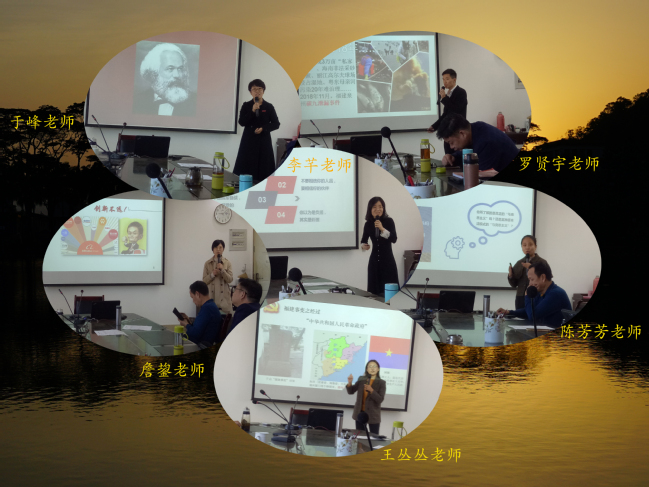 《马克思主义基本原理概论》的主讲教师陈芳芳针对同学们的困惑,从马克思主义的价值性、真理性、青春性的角度指明马克思主义的当代价值,勉励同学们在平凡的生活“建功立业,不负韶华”;《中国近现代史纲要》的主讲教师王丛丛以福建事变为主题,比较客观全面呈现了抗日战争前期国民政府的态度,引导学生评价历史人物与事件时,不要泛泛而谈,也不要一概而论,而应在宏观把握基础上做到具体问题具体分析;《思想道德修养与法律基础》的主讲教师詹鋆以“改革创新的时代要求”为主题,通过结合中美贸易、人工智能时代等时事热点,生动诠释了创新的时代价值;《形势与政策》的主讲教师罗贤宇以“厚植生态文明,建设美丽中国”为展示主题,通过案例法,系统阐述建设生态文明的重要性,增强了同学们的生态环保意识,呼吁大家一定要以身作则,为美丽中国建设贡献自己的一份力量。《马克思主义基本原理概论》的主讲教师的于峰通过“八个时间坐标故事”解答了“马克思是谁?”这个问题,为同学们在今后的学习中深入理解“马克思主义是什么?”做了生动铺垫。5位老师的教学展示之后,《中国近现代史纲要》的主讲教师李芊分享了她参加第五届全省高校青年教师教学竞赛的经验总结。