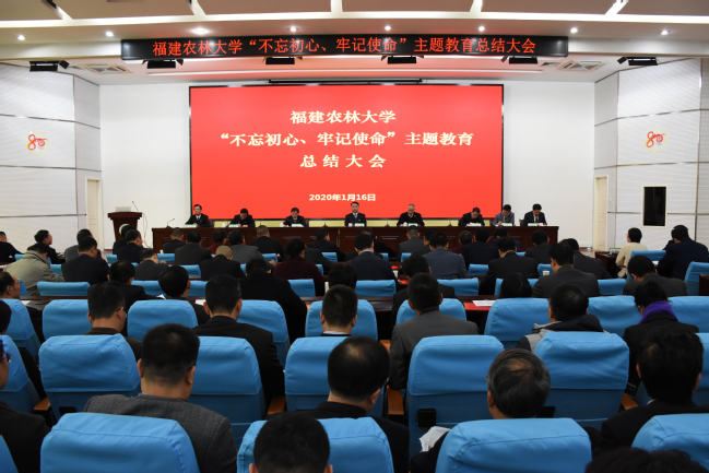 1月16日上午,我校“不忘初心、牢记使命”主题教育总结大会在禧强楼学术报告厅召开。会议深入学习贯彻习近平总书记在中央政治局“不忘初心、牢记使命”专题民主生活会和主题教育总结大会上的重要讲话精神、全省“不忘初心、牢记使命”主题教育总结会议精神。校党委书记、学校“不忘初心、牢记使命”主题教育领导小组组长严金静总结学校开展主题教育取得的主要成效和经验体会,并对今后工作提出要求。他强调,要深刻领会和把握习近平总书记关于不忘初心、牢记使命的重要论述,切实将思想和行动统一到中央决策部署上来,不断巩固和扩大主题教育成果,坚持以立德树人为根本,以强农兴农为己任,引导广大师生增强“四个意识”,坚定“四个自信”,做到“两个维护”,推动立德树人根本任务在学校得到坚决贯彻落实,推动“双一流”高水平大学建设取得更大成效。省委主题教育第10巡回指导组副组长黄绍銮出席会议并讲话,校领导兰思仁、庄祥生、曾华平、邱应龙、黄炎和、郑郁善、郑宝东出席会议,全体中层干部,省级以上党代表、人大代表、政协委员,师生党支部书记代表,学校主题教育领导小组办公室和校内巡回指导组全体成员参加会议。会议由校党委副书记、校长兰思仁主持。