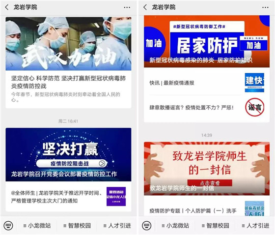 龙岩学校制定了疫情防控工作应急预案,发出了《致龙岩学院师生的一封信》,充分利用校园网、官方微信等平台及时发布省、市、校关于疫情防控的最新通知通告,宣传普及疫情防治知识和防控要求。