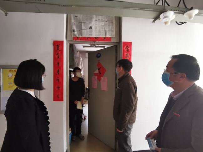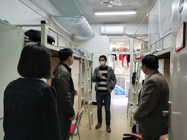 走访过程中,童庆满和郑龙章叮嘱学生要严格按照学校防疫工作通知要求,配合学校、学院相关防疫工作,关注防疫工作动态,特殊时期,要佩戴好口罩,勤洗手,做好自身体温监测和上报,不要随意外出,保持宿舍卫生清洁、通风,不互相串门,注意个人防护。希望同学们能够合理安排时间,静下心,多看书,研究生多看相关领域的文献,认真思考和整理实验思路,毕业生可以着手进行毕业论文的撰写,遇到问题和困难,随时与学院联系。在看望湖北籍博士生柯常姣时,童庆满详细了解了该生家乡疫情防控情况和家中情况,鼓励学生多与家人沟通,共克时艰。