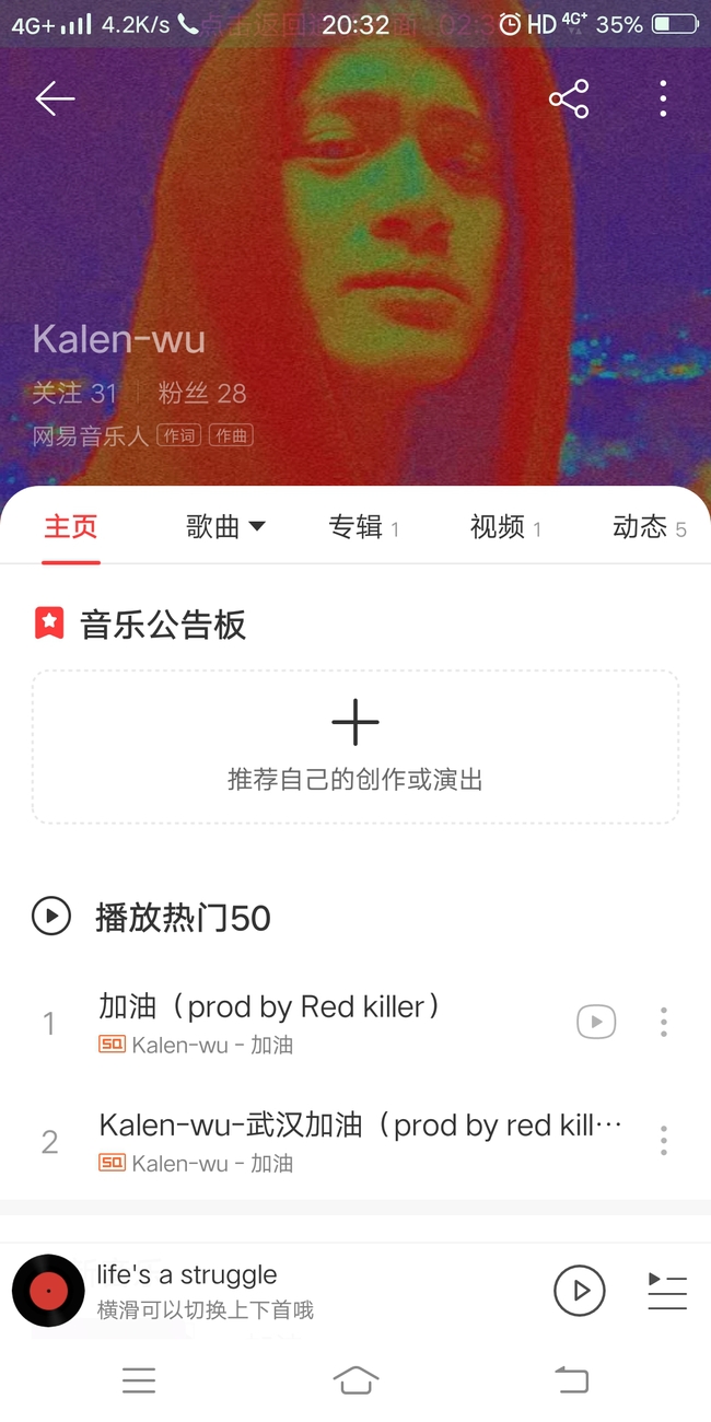 吴凯淋同学创作抗疫歌曲《加油》网易云截图