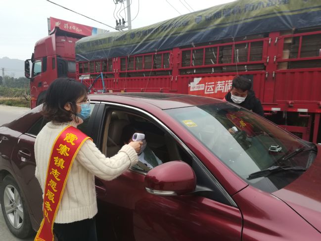 黄昕同学对进出村的人员进行体温测量