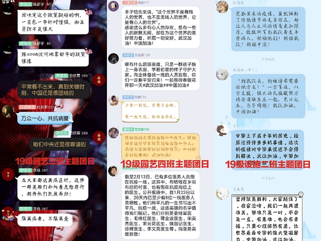 思想政治辅导员通过辅导员工作群、视频会议、点对点电话联系等形式,时时传递弘扬战“疫”正能量,并依托学院青马工程不定期发布“疫情时事”至每个班级,以网上主题团日、主题班会等形式,由辅导员和班主任共同做好主题思想教育,引导青年学子在疫情防控这堂鲜活生动的思政大课堂感知国家的伟大力量、中国特色社会制度的强大生命力,涵养爱党爱国爱社会主义的忠诚情怀和社会担当。