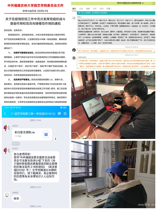 学院党委以实际行动彰显“疫情就是命令、防控就是责任”的政治自觉。1月28日,学院党委班子全员返回工作岗位,第一时间传达学习上级文件会议精神,强调要始终把关爱学生作为疫情防控的第一职责,成立由院党委书记、院长为组长的工作领导小组,细化工作任务、责任落实到岗到人。当日开始学院党政领导、思想政治辅导员在岗值班值守,深入一线、靠前指挥。2月13日,学院党委向15个党支部269名党员发出了《园艺学院党委关于在疫情防控工作中充分发挥党组织战斗堡垒作用和党员先锋模范作用的通知》,全院直接参与一线疫情防控师生中,党团员占总数的87.63%,其中党员占47.85%,党组织和党员以实际行动积极践行一个组织就是一座堡垒、一个党员就是一面旗帜。学院4个教工党支部分别以“做好一名防疫宣传战士”“落实党员教师抗‘疫’行动”“上好防疫线上第一课”等开展线上主题党日活动,全省党建工作样板支部园艺教工第一党支部面对博士生“停滞的试验、焦虑的心”、“试验材料如生命”,党员教师发挥在校优势,积极帮助协调解决。学院32名返乡学生党团员积极冲锋在疫情防控第一线,在承担社区、乡村疫情防控志愿者工作中展现党团员风采。