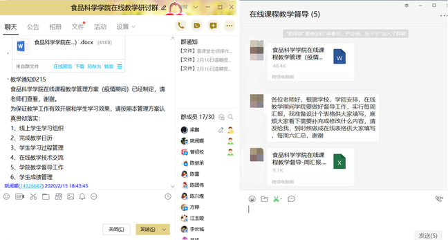 食品科学学院严格落实学校“方案”有关要求,制定实施了学院版《在线教学工作管理方案》和《疫情期间教学工作管理预案》,并由学院党委牵头,成立了食品科学学院在线课程教学工作组,负责学院在线教学的运行管理、课程思政和质量监控工作。值得一提的是,身在湖北老家的田玉庭老师为学生开课,授课后学生发来满屏的感谢,更是让身处疫区的他感动不已。