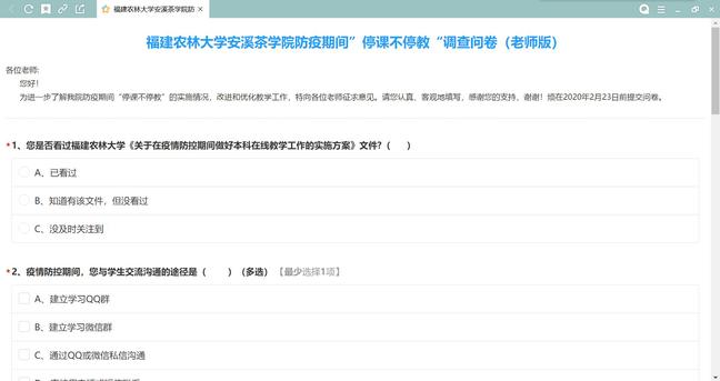 学校决定开展在线教学的第一时间,安溪茶学院就针对在线教学的特点,面向师生设计发放了《安溪茶学院疫情防控期间”停课不停教“调查问卷》,对在线教学的开展条件与师生关切的话题进行进行摸底。以调研结果为基础,安溪茶学院结合学校“方案”,科学推进在线教学工作。学院还未雨绸缪,提前发动教师,共找到93门适合学院师生使用的在线课程,并面向全院收集课程思政教学元素,为参与学校首轮“3+1”模式的执行备足了优质课程资源。