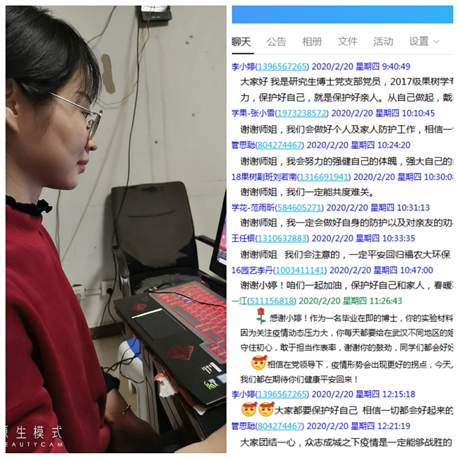 湖北籍博士生党员李小婷在用心战“疫”QQ群给湖北籍的学弟学妹们鼓气打劲