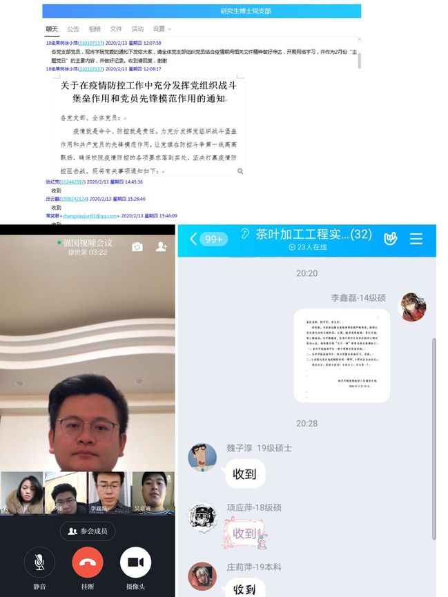 携手抗“疫”,加强网络学习。因疫情突然,部分研究生的笔记本电脑忘带回家、实验材料要浇水等事宜,院留校学生联络人博士生党员田云鹤主动联系学生,帮忙寄送笔记本电脑、应急处理实验材料。近期,博士生党员李敏、徐小萍、邓旭铭和王鹏杰等12人不仅在线上加强自身学术理论研究,也积极解决师弟师妹们关于文献阅读、跟踪学术前沿和实验数据分析等疑问。